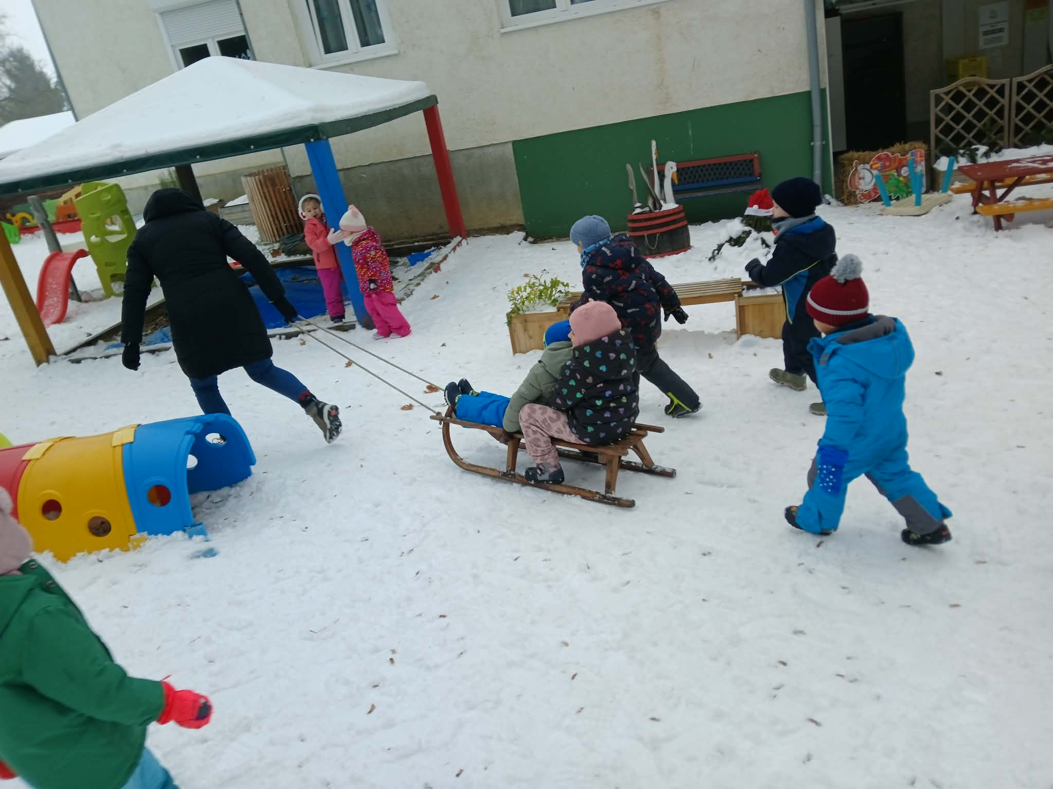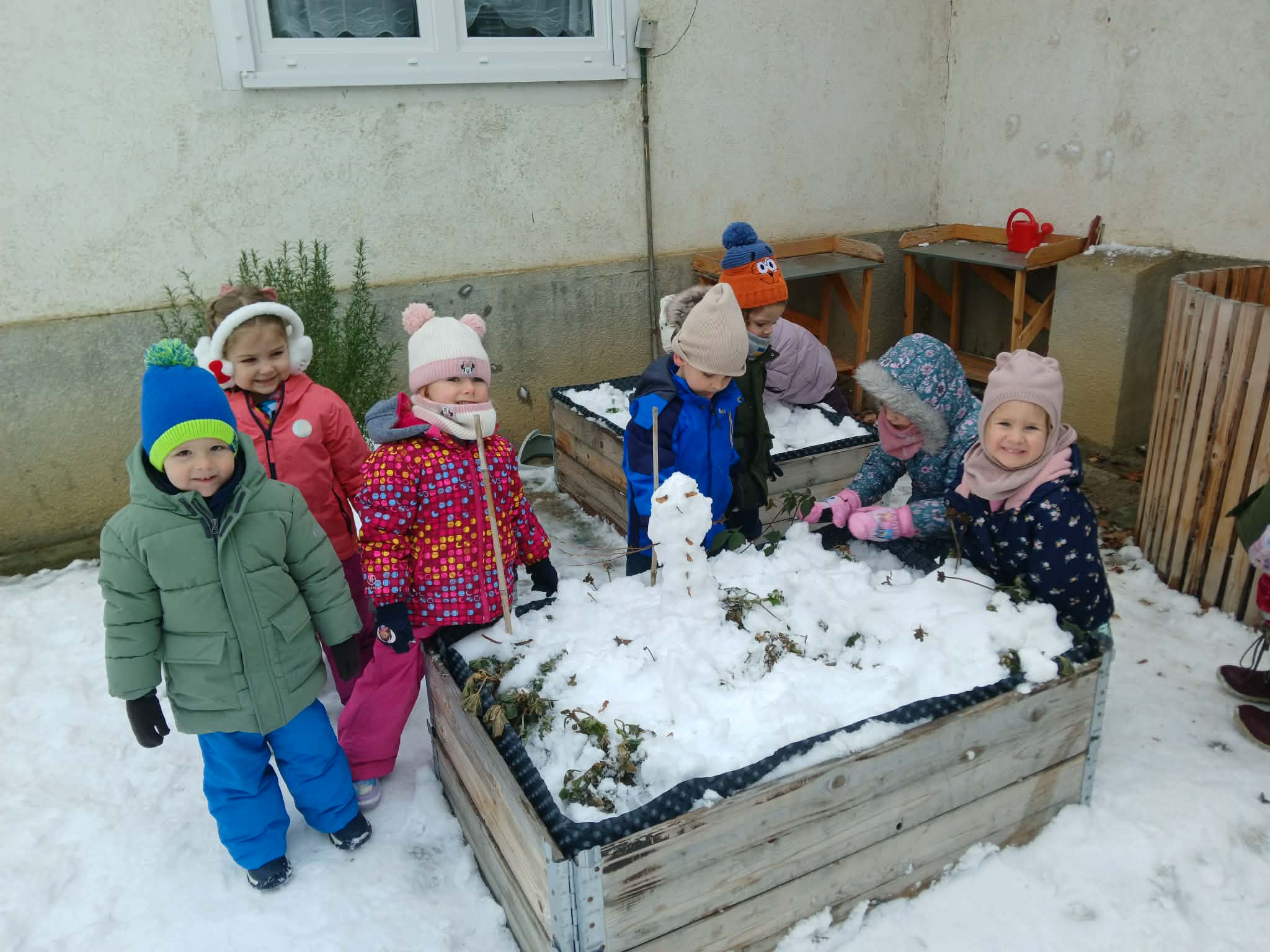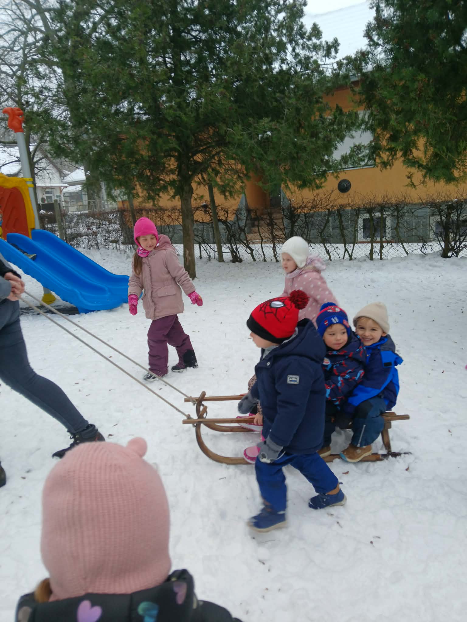 A január igazán megtréfált minket. A hónap elején végre megérkezett az első hó. Igyekeztünk minden percet kihasználni és minél több időt kint tölteni a gyerekekkel. Hóembert építettünk, hógolyóztunk, hóangyalt készítettünk, szánkóztunk. Sokuknak izgalmas találkozás volt a hóval, mert még nem láttak havat.
