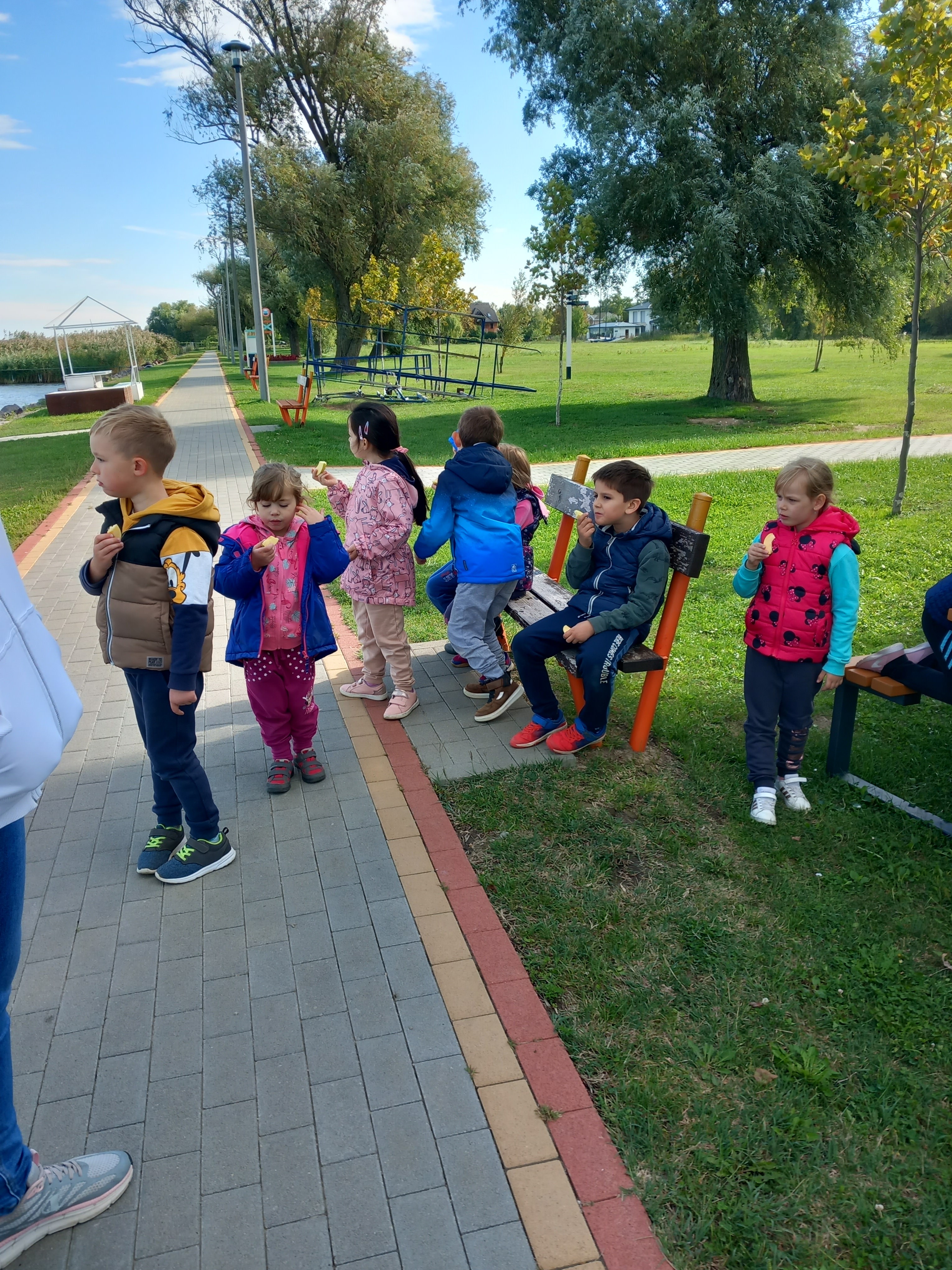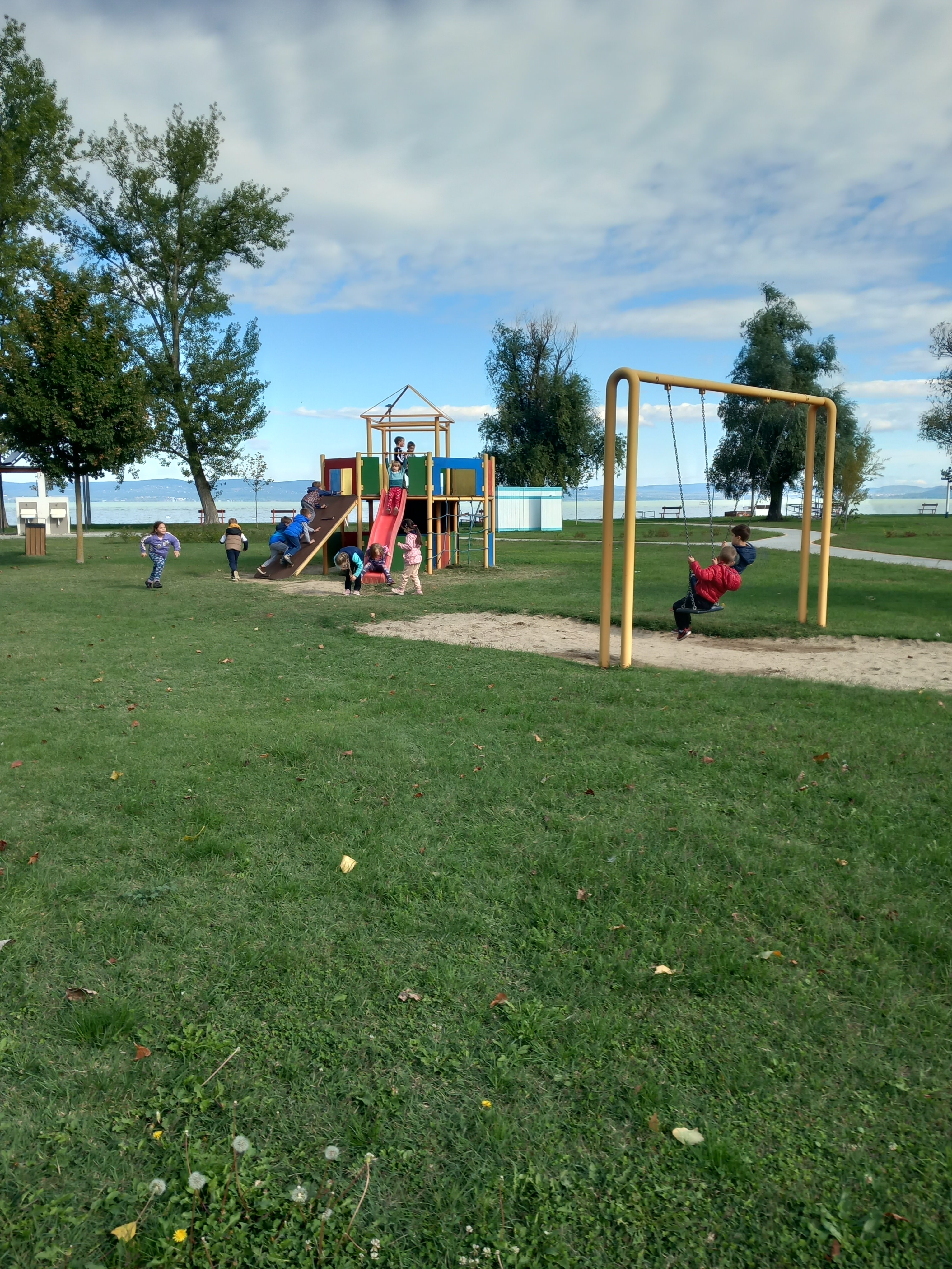 A strand területén kilazították izmaikat a játszótéren, almát ettünk, hattyúkat néztünk, énekeltünk. Közben beszélgettünk a Balatonról, az évszak változásról, nyári élményeik is előkerültek.
